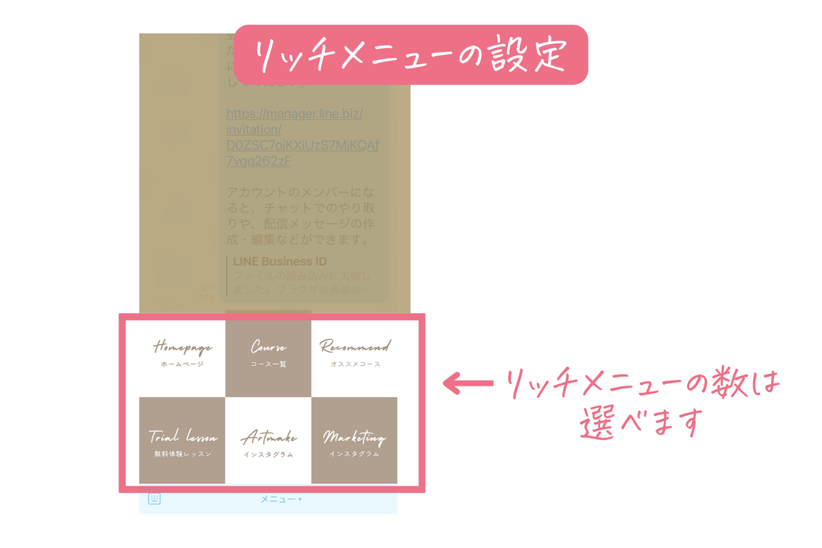 リッチメニューとは、LINEのトーク画面下に表示されるメニューのことをいいます。Instagramやホームページ、問合せなどへの導線設定ができます。