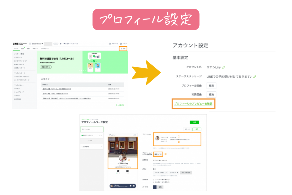 管理画面右上にある「設定」をクリックして、プロフィール画像や背景画像などを編集し、プロフィールを完成させましょう!