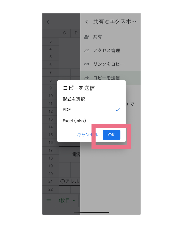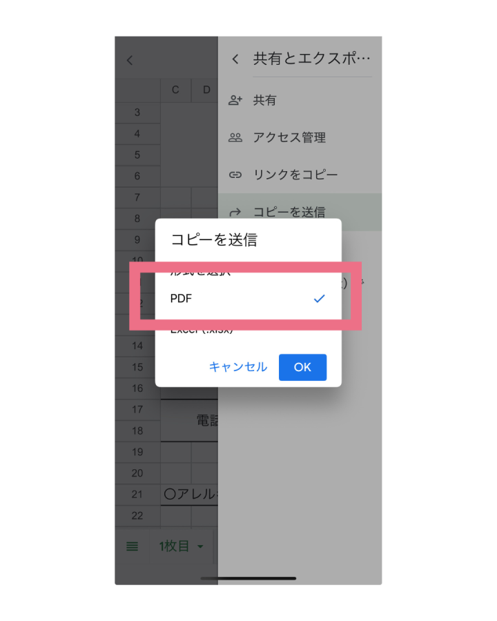 ※スマートフォンの種類(iPhone・Androidの機種差)によっては、操作方法が多少異なる場合があります。その場合は、「スプレッドシート PDF スマートフォン(機種名)」などで検索してご確認ください。