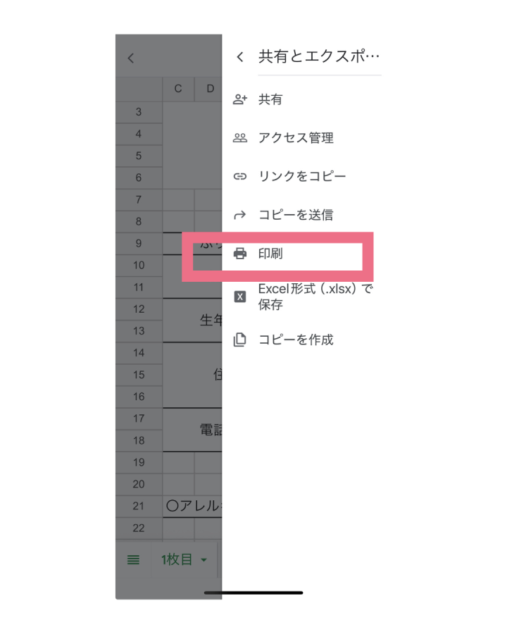 ※スマートフォンの種類(iPhone・Androidの機種差)によっては、操作方法が多少異なる場合があります。その場合は、「スプレッドシート 印刷方法 スマートフォン(機種名)」などで検索してご確認ください。